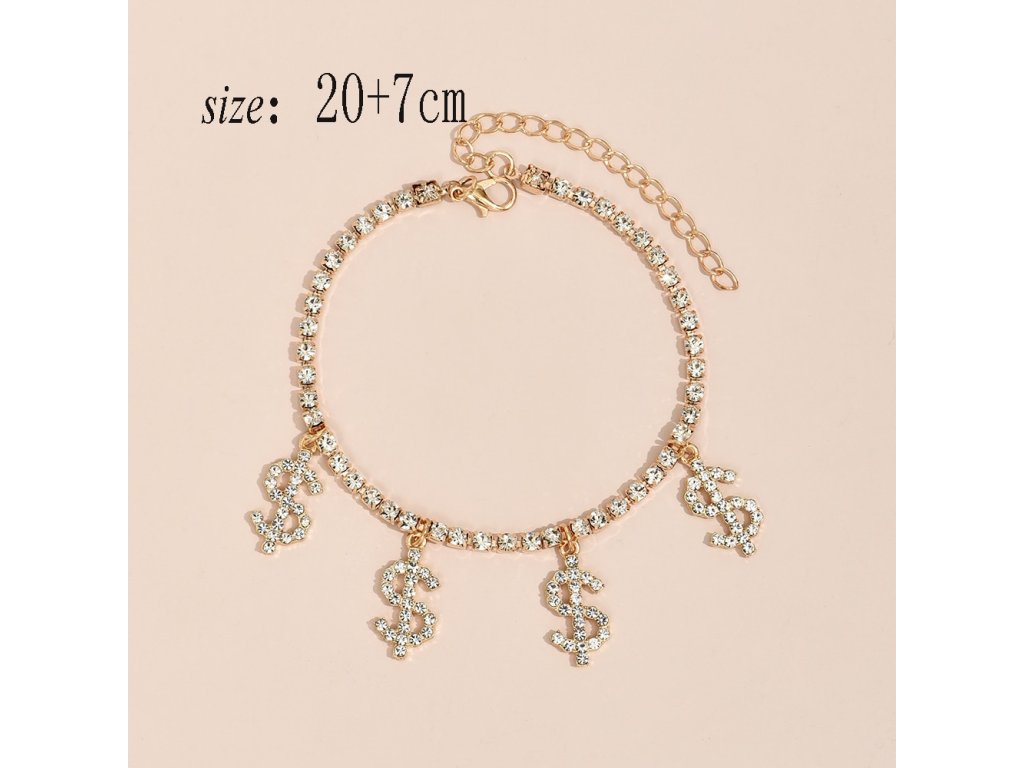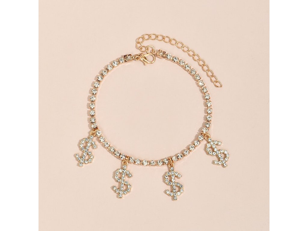 Velmi elegantní náramek zdobený zirkony a přívěsky v designu Dollaru. Možnost nošení na zápěstí, či kotníku.