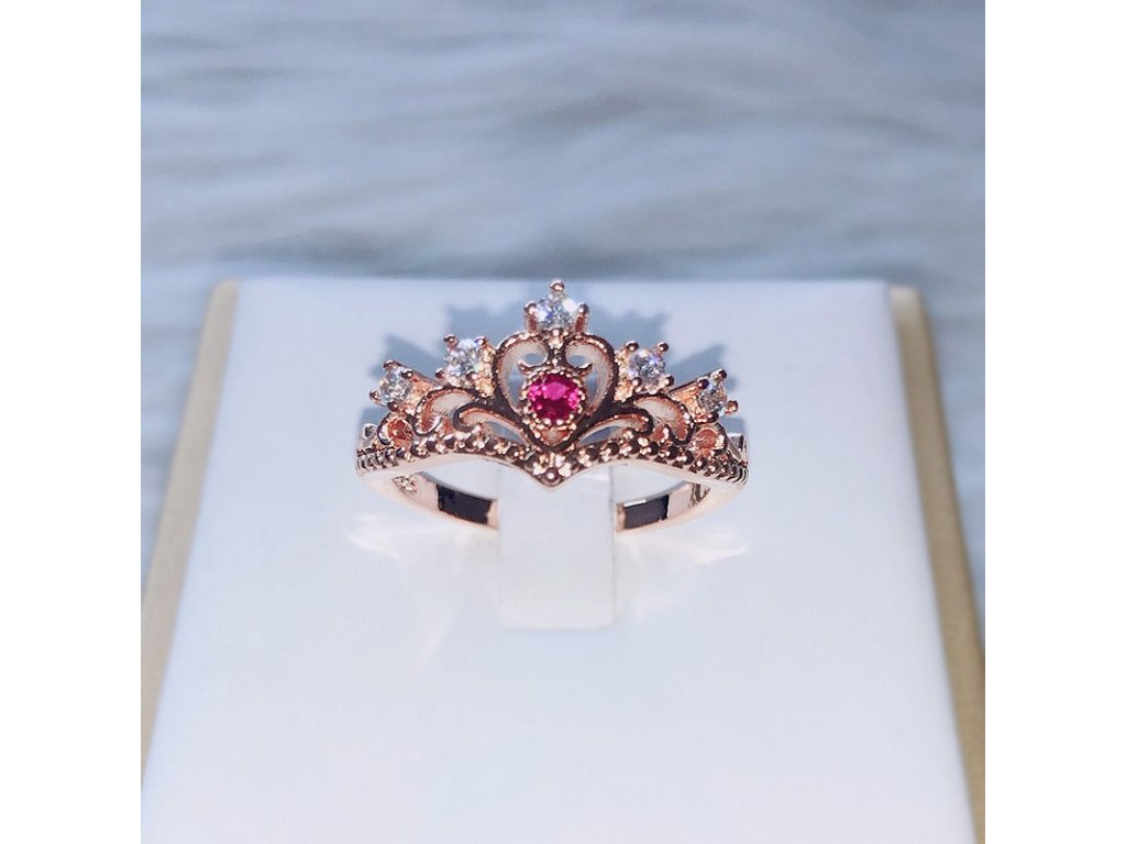 Luxusní prsten ve tvaru korunky osazený růžovým zirkonem velmi jemného brusu v barvě růžového zlata.